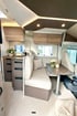 Führerscheinklasse B 4 zugelassene Sitzplätze Einzelbetten im Heck Elektrisches Hubbett für 2 Personen Große Sitzgruppe mit drehbaren Fahrer- und Beifahrersitzen Moderne Küche mit Kochfeld, Spüle und großem Kühlschrank Bad mit Toilette und Dusche Klimaanlage / Heizung Rückfahrkamera Markise Fliegenschutztür an Fenster und Türen Viel Stauraum innen und in der Heckgarage USB-Anschlüsse und Steckdosen SAT-Anlage TV-Smart TV